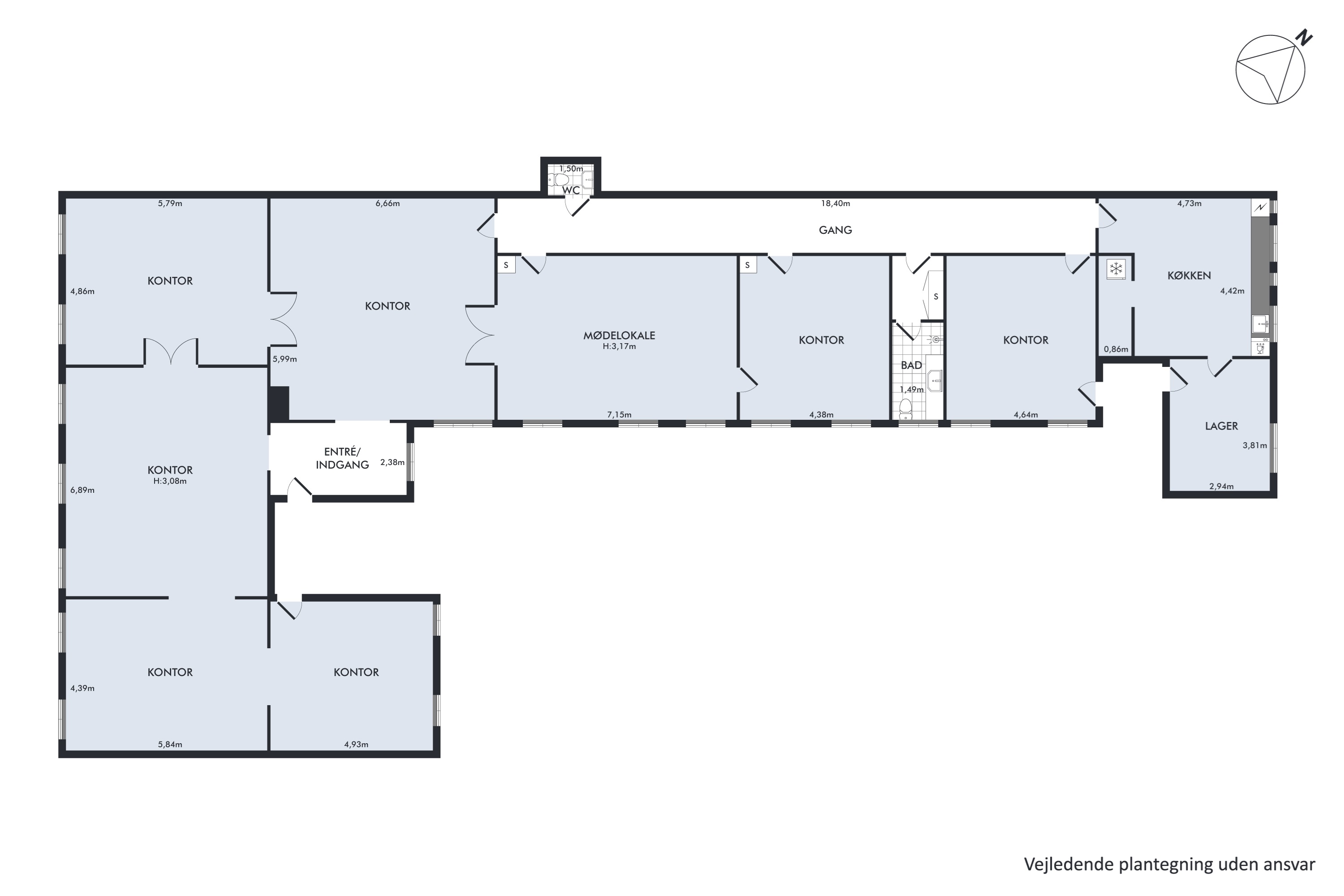 I alt rummer lejemålet 8 stk. meget store kontorlokaler, som kan indrettes til ml. 10-30 medarbejdere, afhængigt af indretning og møblement. Desuden entré, fordelingsgang, lille toilet, stort badeværelse, køkken med spiseplads og lagerlokale.